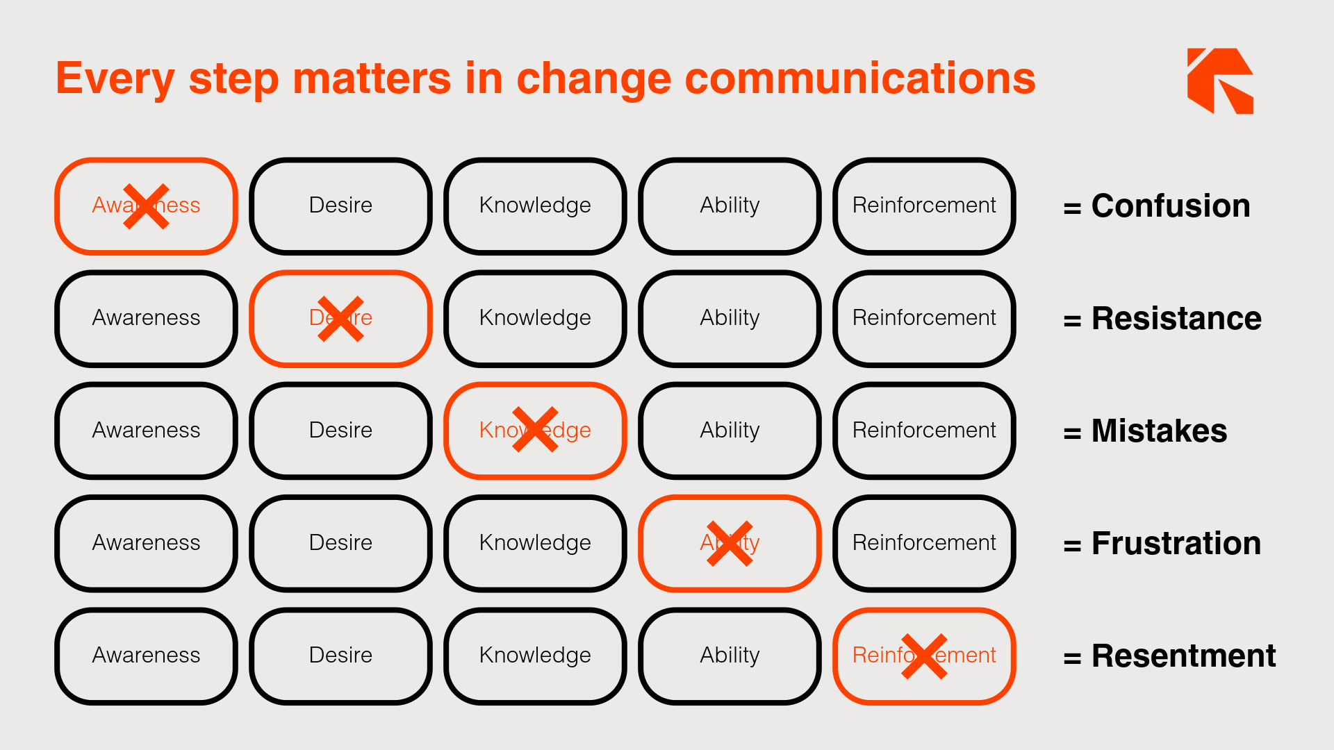 The ADKAR methodology is a helpful tool to have in the back-pocket. It’s simple. And it’s a useful way of communicating change. But it only works if we address every step.